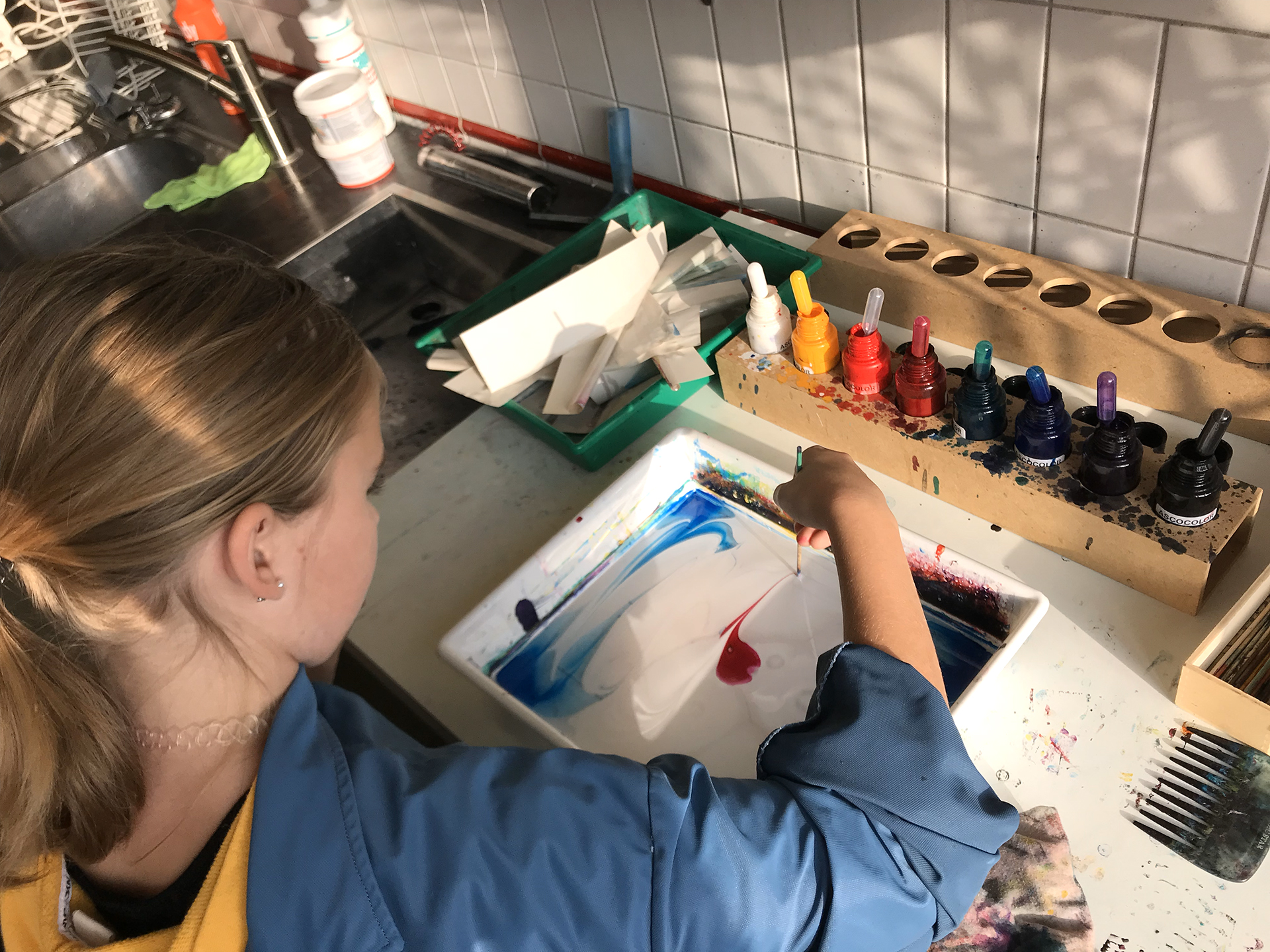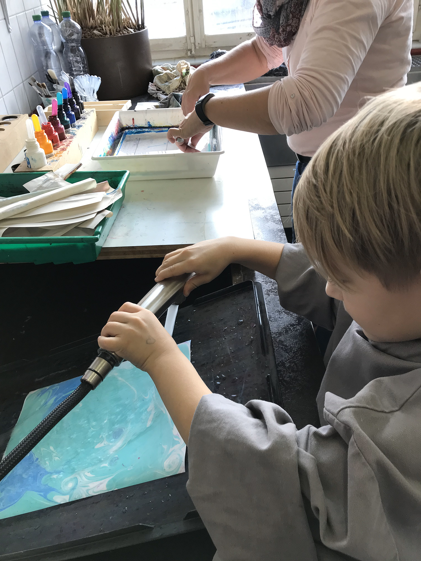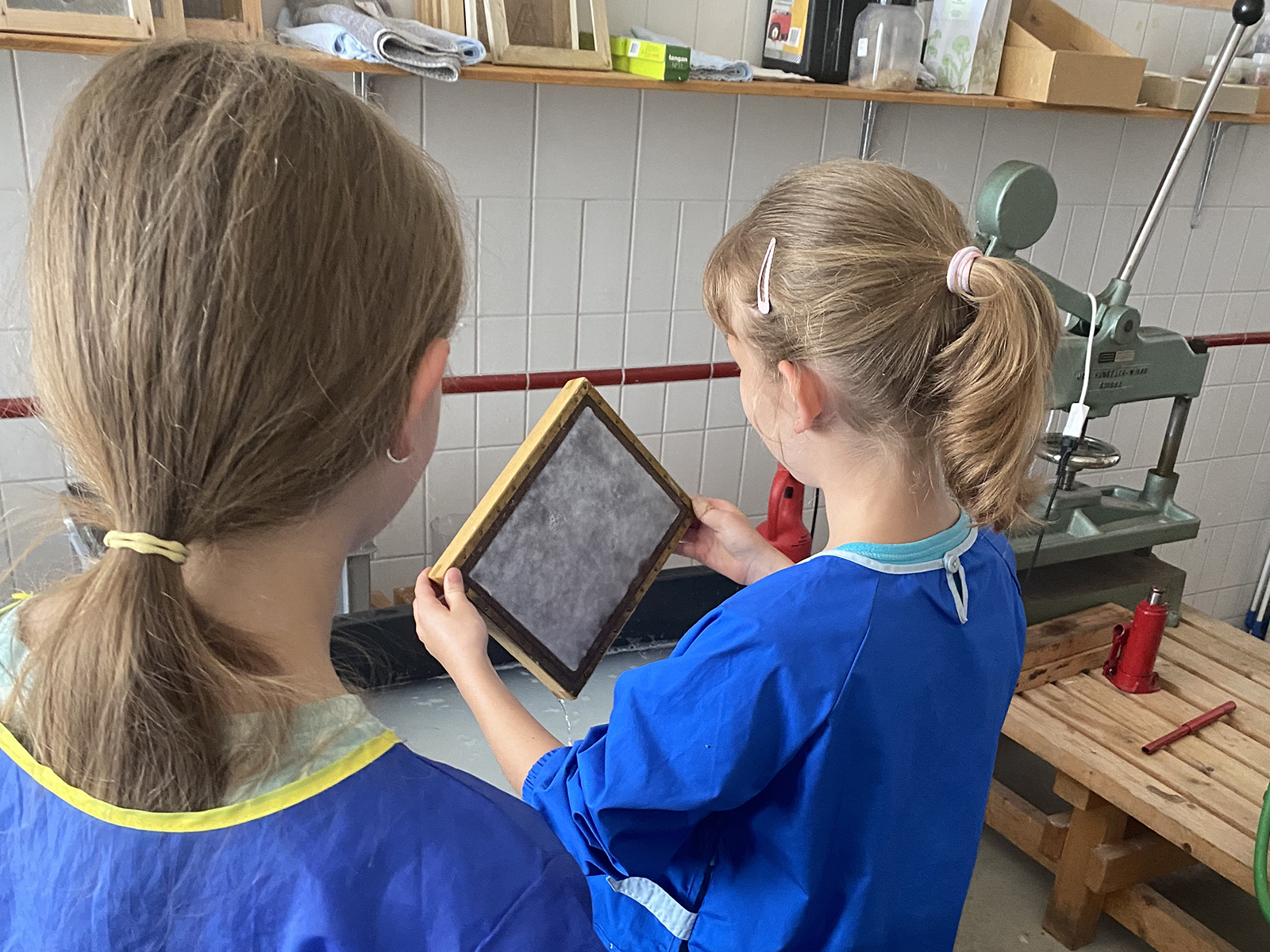 Die Kinder machen ihr eigenes Papier (Papiermachen), drucken Sottos oder binden in der Handbuchbinderei ein Notizbüchlein. Gerne besprechen wir mit Ihnen, was für Sie passt.